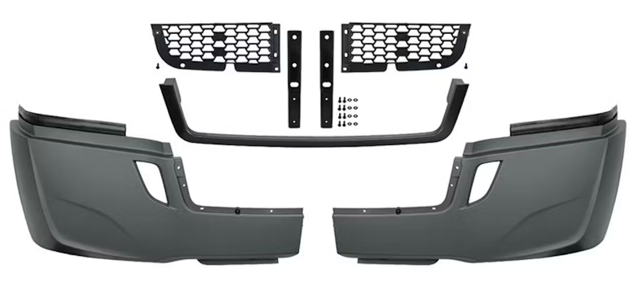 MZ-8680CB-01 DEFENSA ALERON FR FREIGHTLINER 18 19 20 21 22 23 24 25 LATERAL C/HOYO P/FARO NIEBLA C/REFUERZO Y REJILLA CENTRAL 3 PARTES (MOLDURA CENTRAL P/PINTAR) CORRUGADA COMPLETA